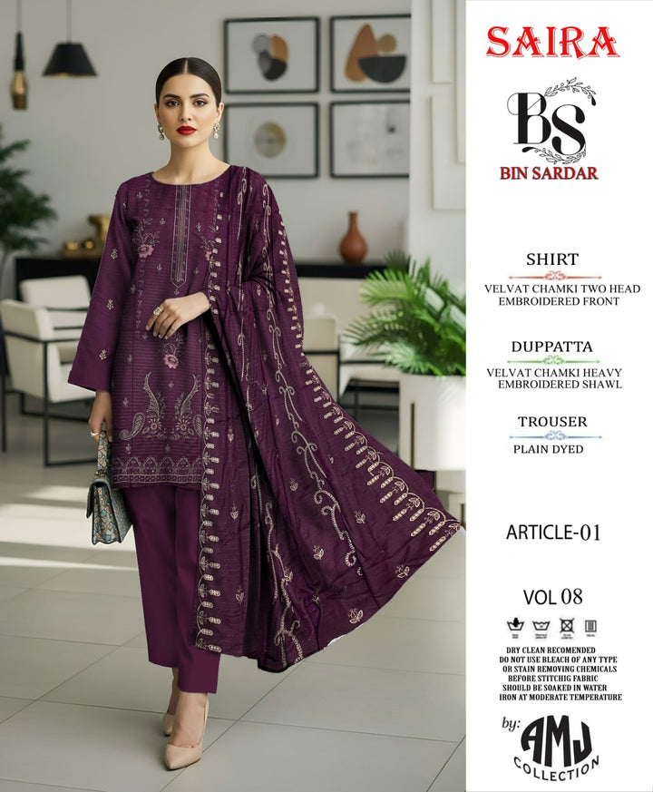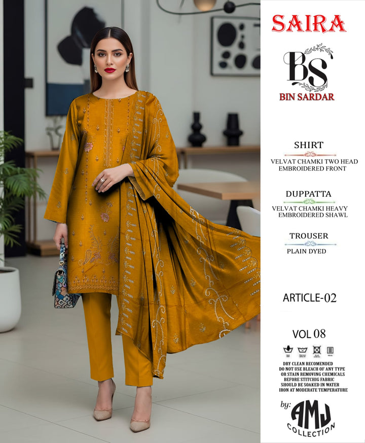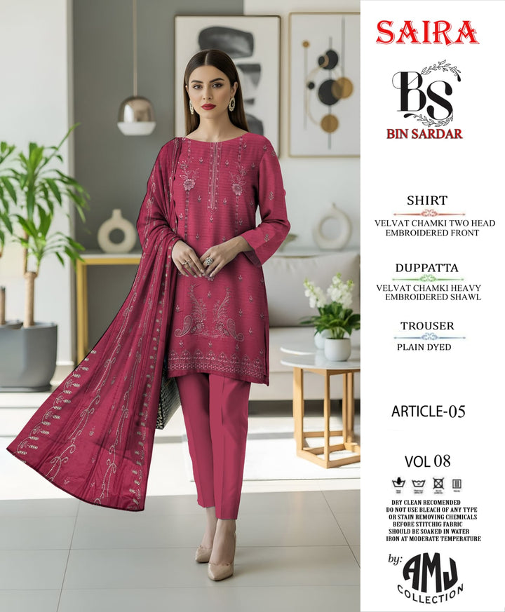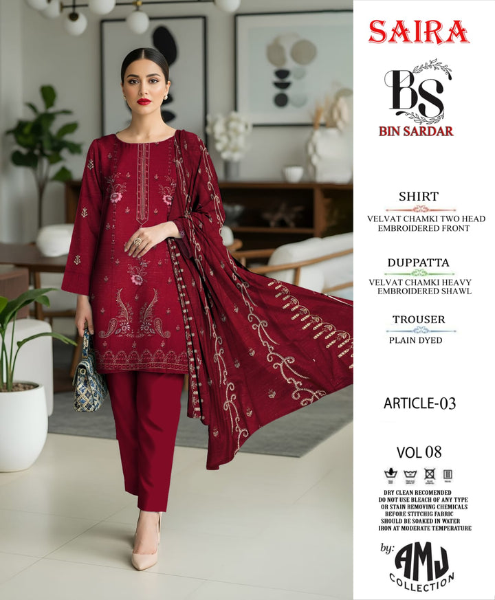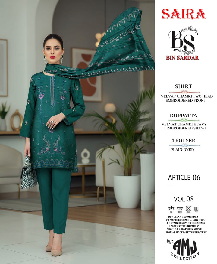 Bin Sardar 2 Head EMB Dhanak Velvet Chamki 3Piece Vol-8 (6 Suits Set)